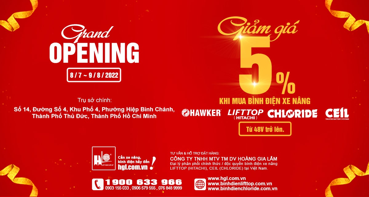 Quý Khách hàng & Quý Đại lý đừng quên chương trình khuyến mãi mừng khai trương trụ sở mới của HGL tại số 14, Đường Số 4, Khu Phố 4, Phường Hiệp Bình Chánh, Thành Phố Thủ Đức, Thành Phố Hồ Chí Minh từ 8/7 đến 9/8/2022 là GIẢM NGAY 5% khi mua bình điện xe nâng mới 100%, từ 48V trở lên nhé.