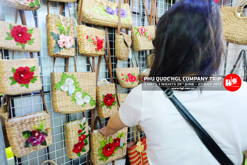 Một bạn nữ nhân viên HGL Corp đang chọn mua túi xách thủ công tại chợ đêm Phú Quốc.