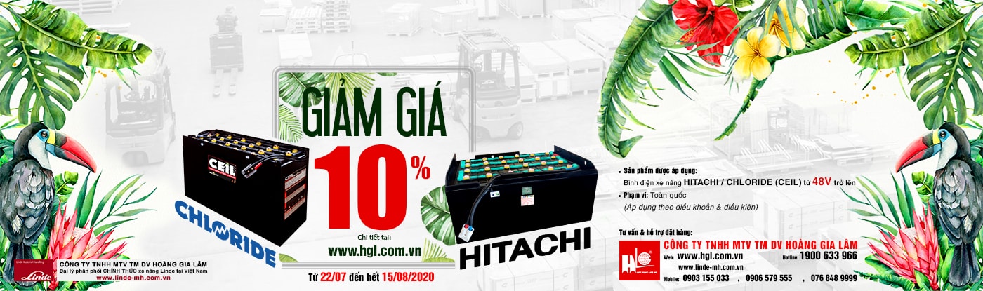 Cụ thể, khi Quý Khách mua bất kỳ bình điện xe nâng HITACHI hoặc CHLORIDE (CEIL) mới 100%, điện áp từ 48V trở lên tại HGL sẽ được giảm giá 10% giá trị đơn hàng.