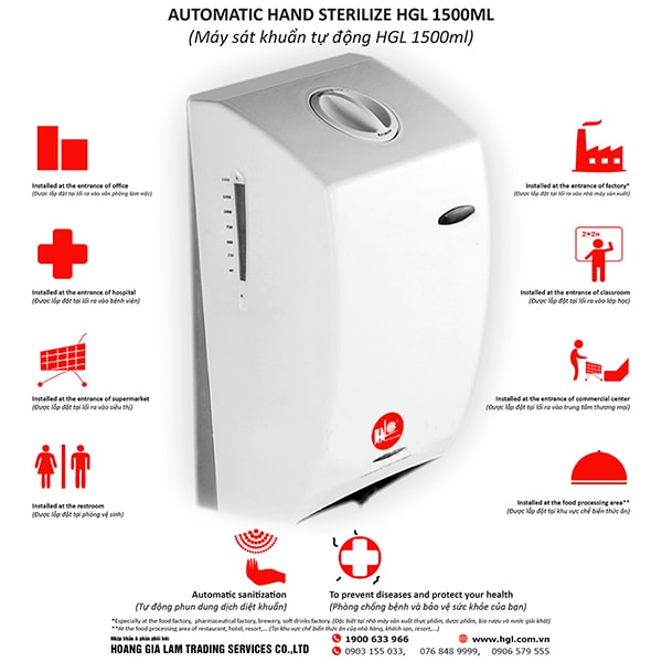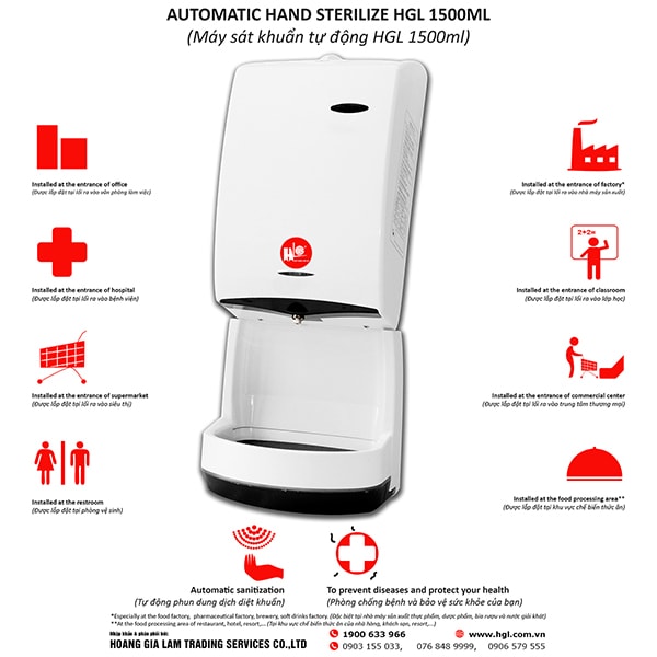 Máy sát khuẩn tự động HGL 1500ml không cần chạm tay, sensor sẽ nhận biết và phun chất diệt khuẩn dưới dạng sương giúp giữ tay bạn luôn luôn sạch sẽ.