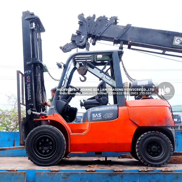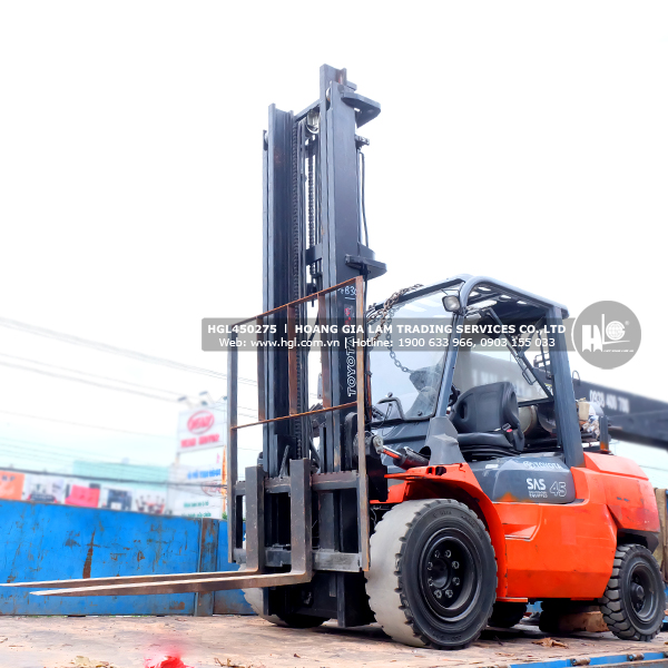 Xe nâng gas TOYOTA 02-7FG40 (HGL450275) đã qua sử dụng có tải trọng nâng tối đa 4.5 tấn. Xe nâng cao tối đa 5m, khung nâng 2 tầng.